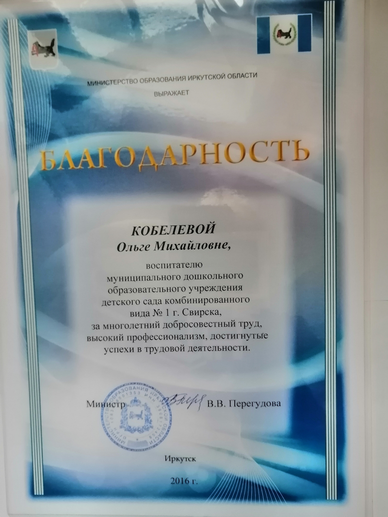 Благодарность от Министерства образования